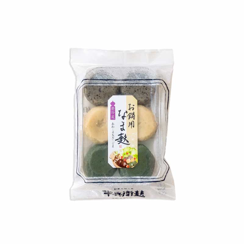 1袋で3種類(あわ・よもぎ・ごま)の味が楽しめる丸い形のお鍋用なま麸。